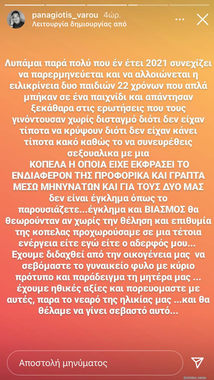 Τα 2 αδέλφια με “φυσικότητα” απάντησαν “ναι το είπαμε προηγούμενος…είχα πάει εγώ πρώτα και μετά πήγε ο Παναγιώτης…Οχι κοπέλα όμως…οχι κοπέλα του Χρήστου ή κοπέλα μου, όχι σχέση”…”είμαστε ίδιοι παντού”….