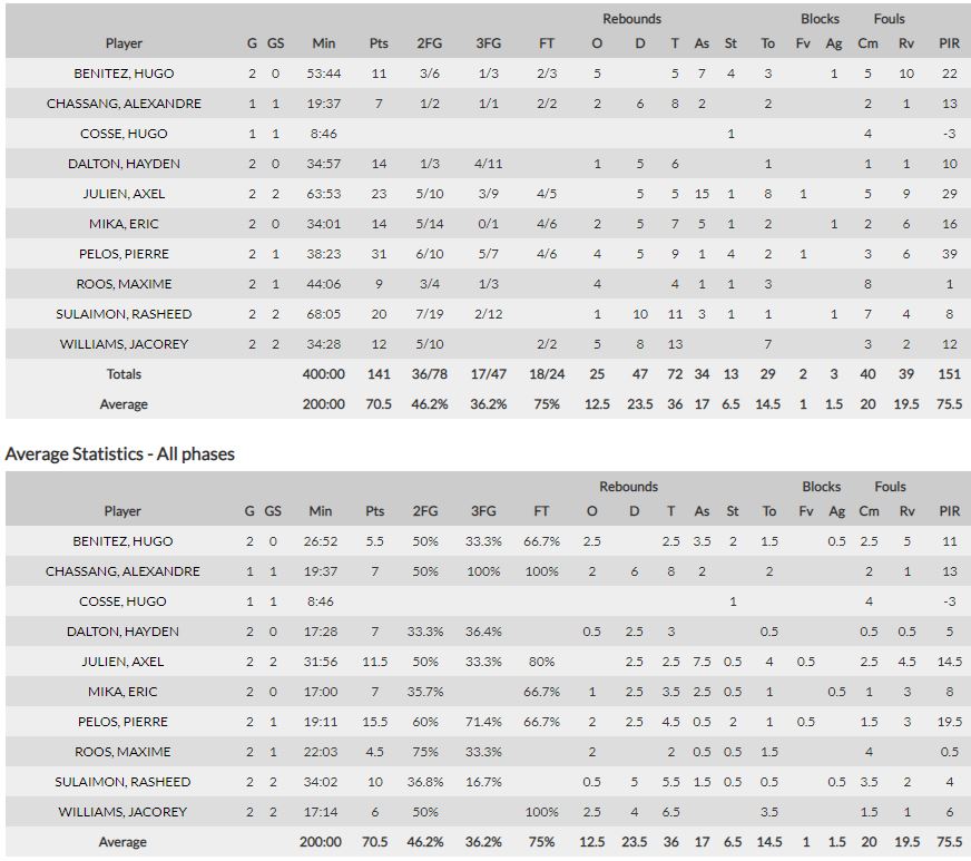 Και συνεχίζουμε με τη στατιστική ανάλυση της αντιπάλου της ελληνικής ομάδας. Όπως μπορείτε να δείτε στους πίνακες (συνολικά αλλά και σε μέσο όρο) οι Πελός, Ζιλιέν, Μπενίτεζ και Σουλαϊμόν πετυχαίνουν τους 85 από τους 141 πόντους της Μπουρζ. Παραπάνω από τους μισούς δηλαδή. Οι τέσσερις τους έχουν και τα 11 από τα 17 εύστοχα τρίποντα της ομάδας. Ο Πελός έχει σχεδόν τις μισές ασίστ της Μπουρζ (15 από τις 34) ενώ μαζί με τον Μπενίτεζ έχουν τα 8 από τα 14 κλεψίματα της ομάδας τους. Επίσης αυτή η τετράδα, που φαίνεται καθαρά ότι καθοδηγεί την Μπουρζ έχει τα 29 από τα 39 κερδισμένα φάουλ της ομάδας…