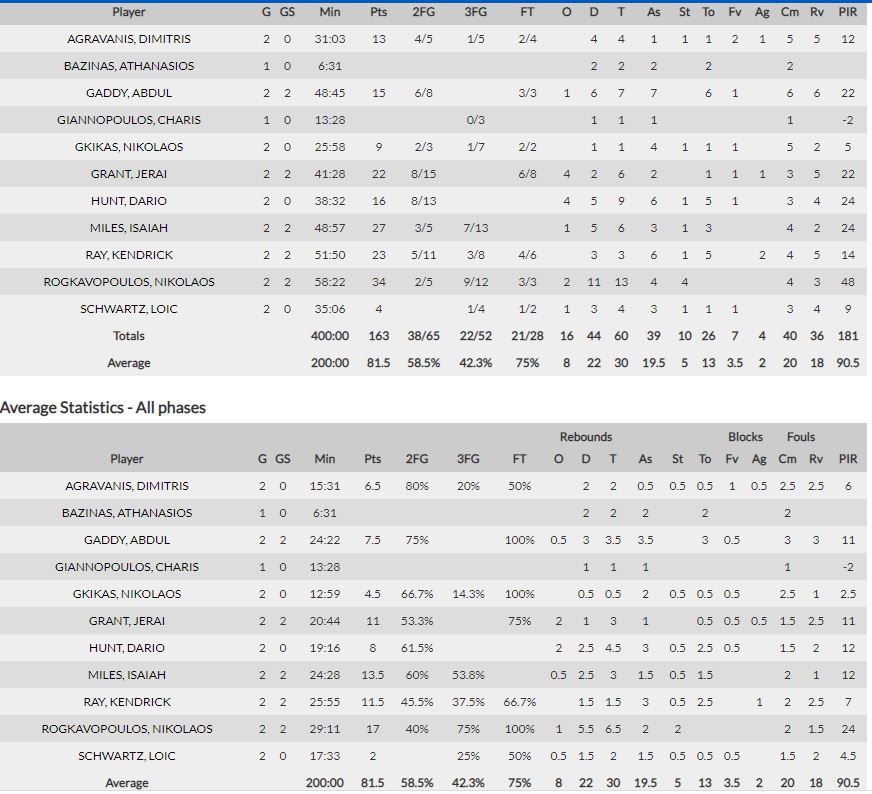 Σε μια πρώτη ματιά, προκαλεί πολύ μεγάλη εντύπωση η παρουσία που έχει ο Νίκος Ρογκαβόπουλος. Πρώτος σκόρερ με μέσο όρο 17 πόντους, πρώτος ριμπάουντερ (6,5), πρώτος στα κλεψίματα (2) αλλά και στην αξιολόγηση (24)! Τα 9/12 τρίποντα που έχει σε δύο αγώνες επίσης είναι εκπληκτικός αριθμός.