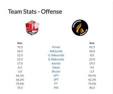 Στη συνέχεια μπορούμε να δούμε την σύγκριση της Μπουρζ με τον Προμηθέα σε ομαδικό επίπεδο. Όπως μπορείτε να δείτε ο Προμηθέας υπερέχει στην επιθετική παραγωγή, στις ασίστ, στα ποσοστά και στις τάπες. Αλλά υπάρχει ένα σημείο στους Γάλλους το οποίο θα πρέπει να προσέξει ιδιαίτερα η ελληνική ομάδα. Αυτό έχει να κάνει με τα επιθετικά ριμπάουντ (12,5 κατά μέσο όρο).