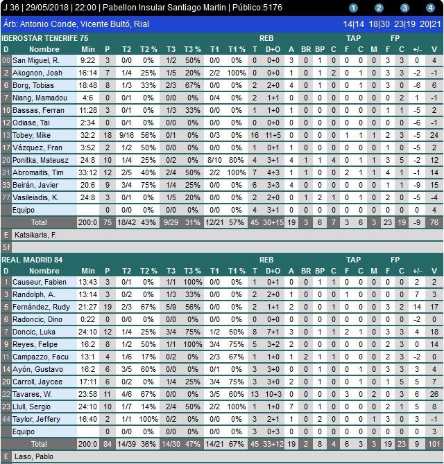 Στον αντίποδα, ο Μάικ Τομπέι με 18 πόντους ήταν ο πρώτος σκόρερ για την Τενερίφη που σταματάει το αγωνιστικό της ταξίδι. Αναφορικά με τον Κώστα Βασιλειάδη, ο Έλληνας φόργουορντ έμεινε στο παρκέ για περίπου 24 λεπτά και είχε 3 πόντους με 1/5 τρίποντα και 2 ριμπάουντ.