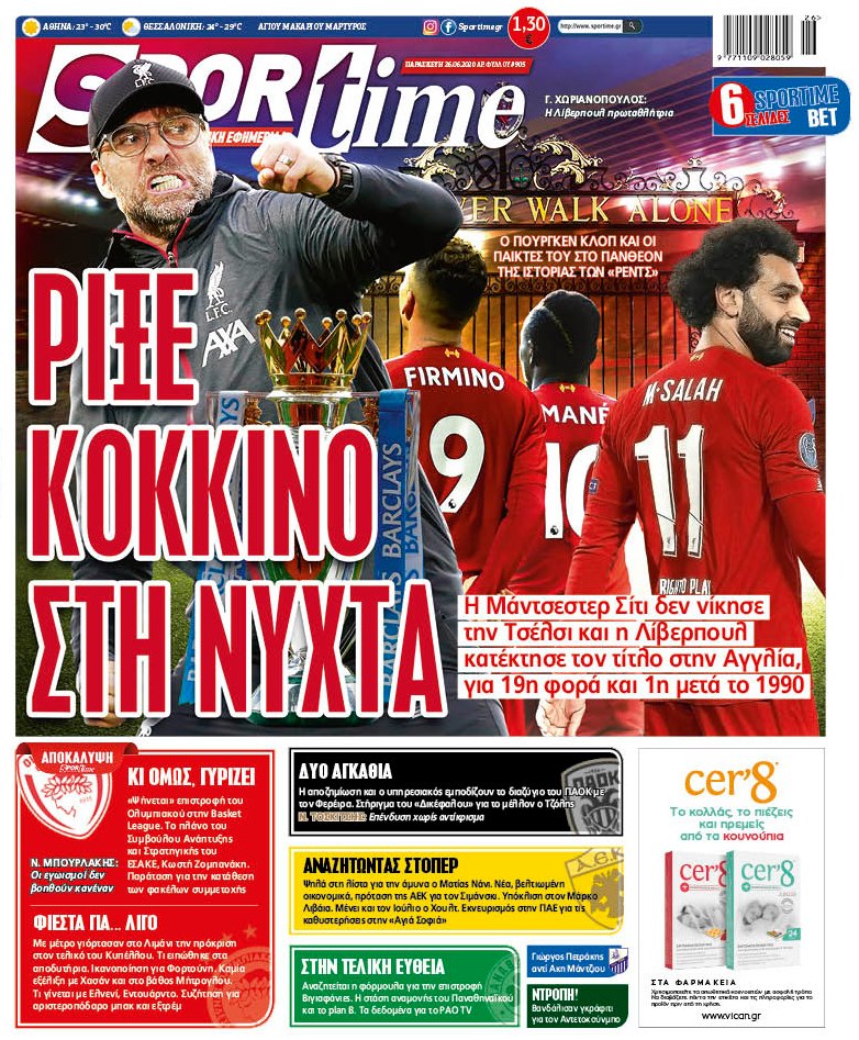 Διαβάστε τι αναφέρει το σημερινό (26/6) πρωτοσέλιδο του Sportime, το οποίο είναι αφιερωμένο στη νέα πρωταθλήτρια Αγγλίας, τη Λίβερπουλ!