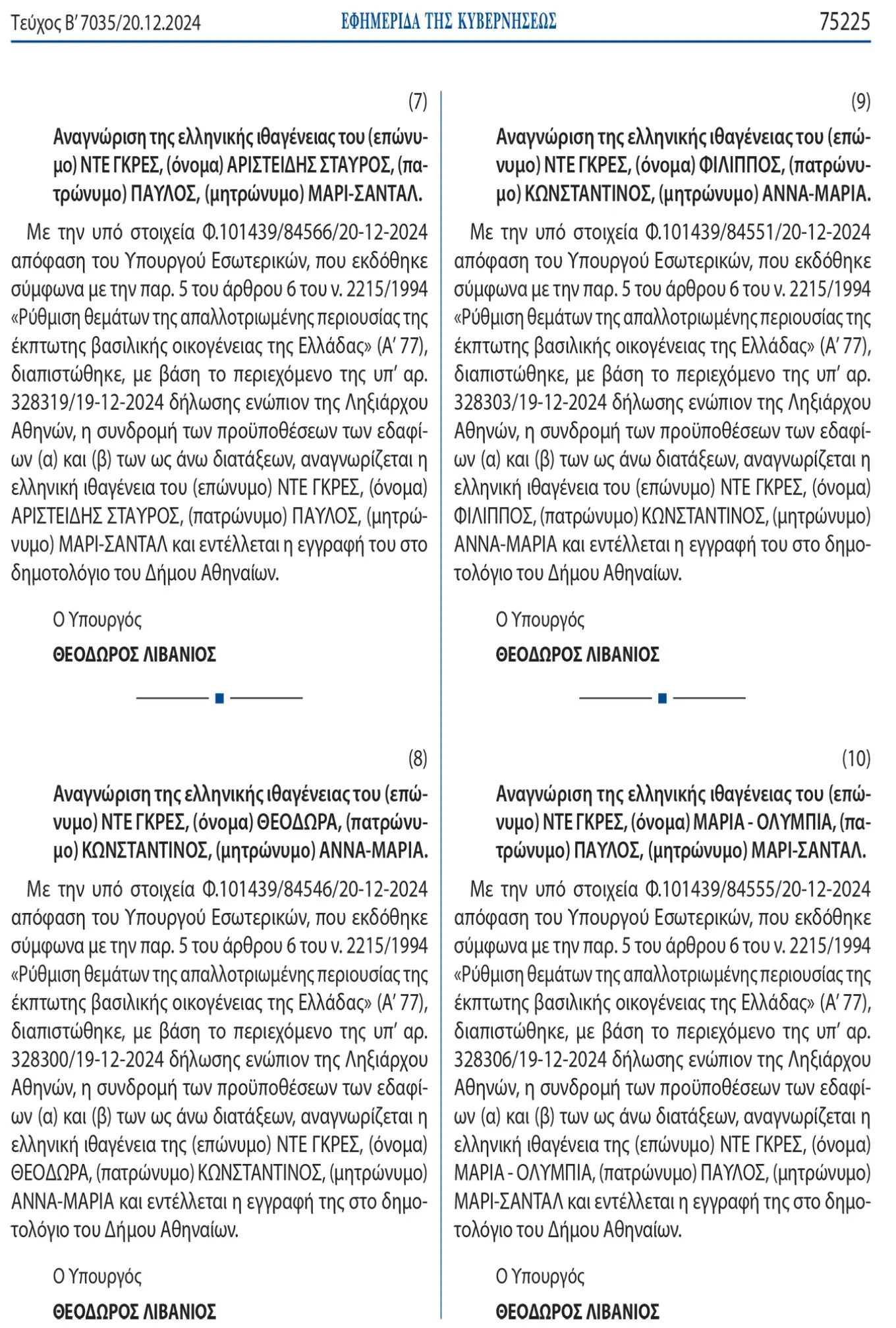 Θέμα χρόνου να γίνουν κι επίσημα Έλληνες πολίτες 10 μέλη της τέως βασιλικής οικογένειας, καθώς δημοσιεύτηκε στο ΦΕΚ η απόφαση του υπουργού Εσωτερικών Θοδωρή Λιβάνιου για την αναγνώριση της ελληνικής ιθαγένειας στα πέντε παιδιά του τέως βασιλιά Κωνσταντίνου και τα πέντε παιδιά του πρωτότοκου γιου του Παύλου.