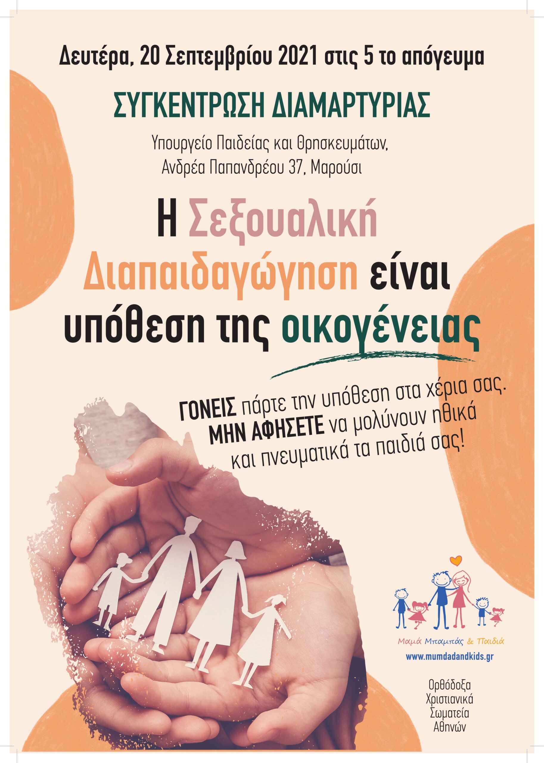 Πιο αναλυτικά, όπως διαβάζουμε στην ανακοίνωση, τα Ορθόδοξα Χριστιανικά Σωματεία των Αθηνών μαζί με το Πανελλήνιο Κίνημα «Μαμά Μπαμπάς και Παιδιά» το οποίο έχει στόχο την ανάδειξη, την υπεράσπιση και την προώθηση των αξιών και των ιδανικών της Ελληνορθόδοξης Οικογένειας, με αφορμή την επιβολή από το Υπουργείο Παιδείας του μαθήματος της «Ολοκληρωμένης ή Συμπεριληπτικής» Σεξουαλικής Διαπαιδαγώγησης στα σχολεία από την νηπιακή ηλικία, καλεί όλους, γονείς, εκπαιδευτικούς, αλλά και κάθε συνειδητοποιημένο Έλληνα πολίτη, σε μια ειρηνική συγκέντρωση διαμαρτυρίας την Δευτέρα, 20 Σεπτεμβρίου 2021 και ώρα 5μμ, στην πύλη του Υπουργείου Παιδείας και Θρησκευμάτων, στο Μαρούσι.