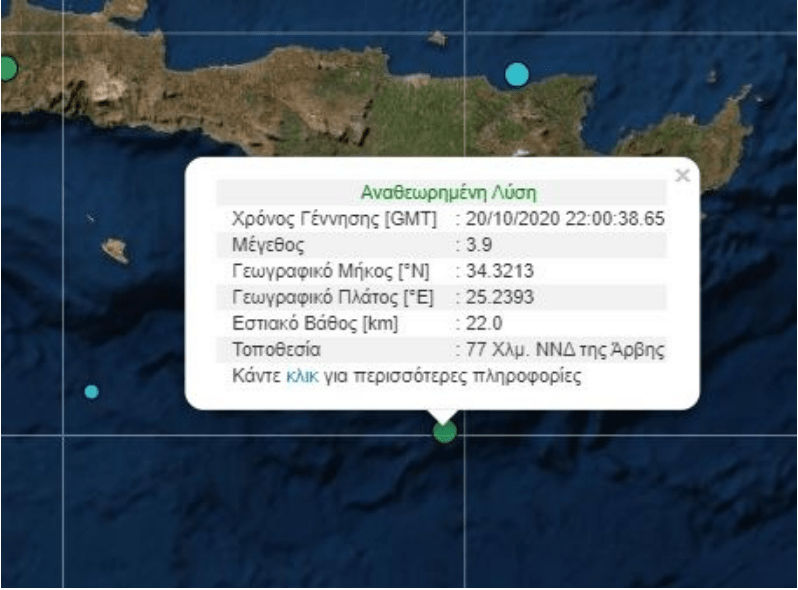 Σύμφωνα με την ενημέρωση από το Γεωδυναμικό Ινστιτούτο Αθηνών, η σεισμός στην Κρήτησημειώθηκε στη 1 τα ξημερώματα και είχε επίκεντρο 77 χιλιόμετρα νότια της Αρβης. Το εστιακό του βάθος εκτιμήθηκε στα 22 χιλιόμετρα.