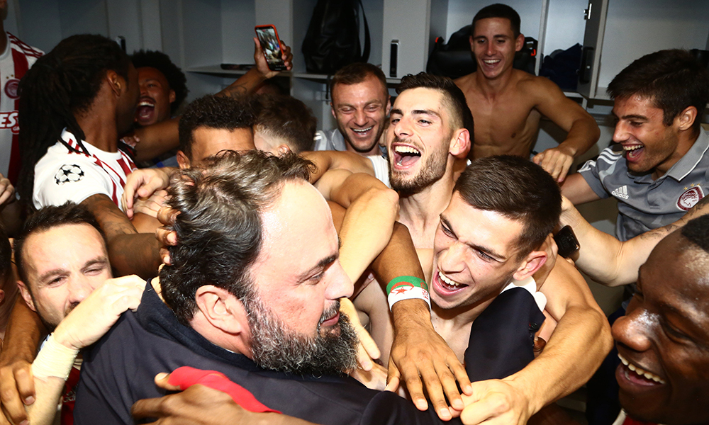 Μετά το σφύριγμα του διαιτητή στη Ρωσία, όλοι οι «ερυθρόλευκοι» ποδοσφαιριστές και προπονητές, έγιναν «ένα»! Άρχισαν αμέσως οι πανηγυρισμοί για την πρόκριση στους ομίλους του Champions League. Όλοι όσοι ήταν στον «ερυθρόλευκο» πάγκο μπήκαν μέσα.