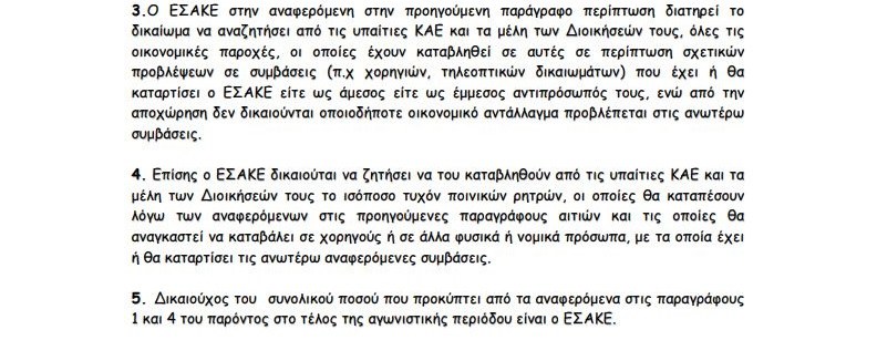 Επίσης ο ΕΣΑΚΕ δικαιούται να ζητήσει να του καταβληθούν από τις υπαίτιες ΚΑΕ και τα μέλη των Διοικήσεών τους το ισόποσο τυχόν ποινικών ρητρών, οι οποίες θα καταπέσουν λόγω των αναφερόμενων στις προηγούμενες παραγράφους αιτιών και τις οποίες θα αναγκαστεί να καταβάλει σε χορηγούς ή σε άλλα φυσικά ή νομικά πρόσωπα, με τα οποία έχει ή θα καταρτίσει τις ανωτέρω αναφερόμενες συμβάσεις.
