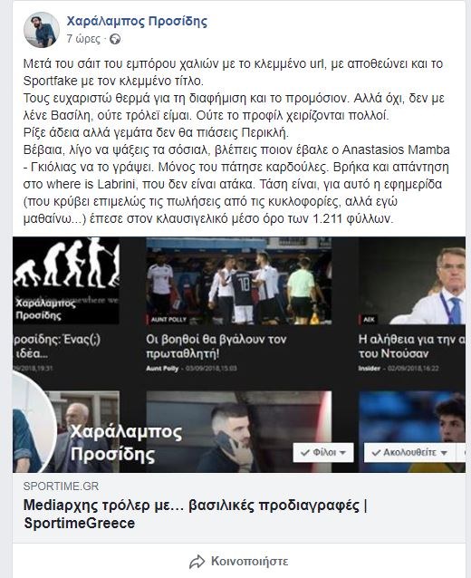 Μικρή σημασία έχει, το γράψαμε εξάλλου, ποιος είναι ο Μπάμπης (ο Χαράλαμπος ντε) ο Προσίδης. Σας είπαμε. Σημασία έχει κατά πόσο ισχύουν και πόσους… αγγίζουν αυτά που γράφει. Μας αναφέρει μάλιστα και σαν Sportfake με κλεμμένο όνομα.