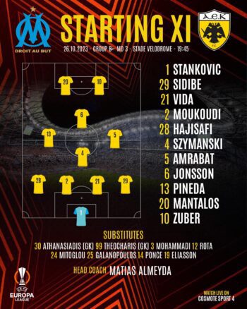 Αναλυτικά η ενδεκάδα της ΑΕΚ: Στάνκοβιτς, Σιντιμπέ, Μουκουντί, Βίντα, Χατζισαφί, Σιμάνσκι, Γιόνσον, Μάνταλος, Τσούμπερ, Άμραμπατ, Πινέδα.