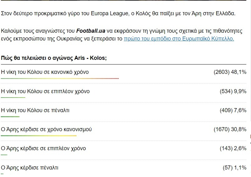 Σε γκάλοπ που «τρέχει» ουκρανική ιστοσελίδα τίθεται το ερώτημα για την έκβαση του αγώνα Άρης-Κόλος Κοβαλίβκα με τους αναγνώστες της να «βλέπουνε» ξεκάθαρα πρόκριση της ομάδας της χώρας.