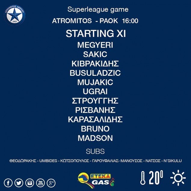 O Ατρόμητος θα ξεκινήσει με τον Μέγιερι κάτω από τα δοκάρια, τους Καρασαλίδη, Ρισβάνη, Στρούγγη στο κέντρο της άμυνας, Κιβρακίδη και Σάκιτς στα πλάγια, Μαντσόν, Μπουσούλαζιτς στο κέντρο μαζί με τον Μπρούνο, ενώ στην επίθεση θα είναι ο Ουγκράι με τον Μούγιακιτς.
