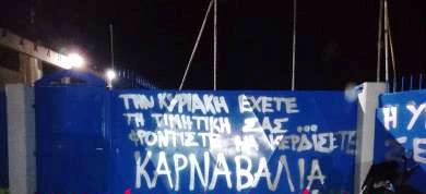 «Η υπομονή μας τελειώνει. Σεβασμός στην ιστορία του Ηρακλή» και «Την Κυριακή έχετε τη τιμητική σας. Φροντίστε να κερδίσετε, καρναβάλια», ήταν δυο από τα χαρακτηριστικά συνθήματα που γράφτηκαν.