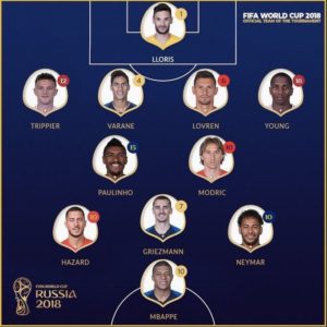 Η καλύτερη ενδεκάδα αποτελείται από τους: Λιορίς, Τρίπιερ, Βαράν, Λόβρεν, Γιανγκ, Παουλίνιο, Μόντριτς, Αζάρ, Γκριεζμάν, Νεϊμάρ, Εμπαπέ