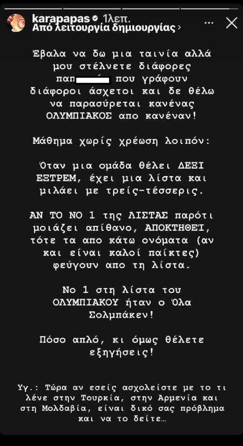 «Έβαλα να δω μια ταινία αλλά μου στέλνετε διάφορες παπ@@@@ που γράφουν διάφοροι άσχετοι και δεν θέλω να παρασύρεται κανέναν ΟΛΥΜΠΙΑΚΟΣ από κανέναν!