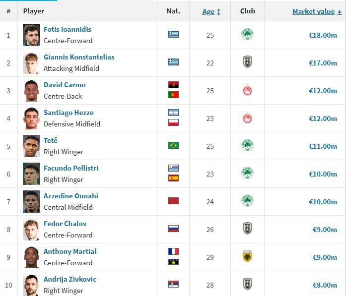Οι υπόλοιποι τρεις παίκτες της δεκάδας είναι ο Φέντορ Τσαλόφ του ΠΑΟΚ (9 εκατ. ευρώ), ο Άντονι Μαρσιάλ της ΑΕΚ (9 εκατ. ευρώ) και ο Αντρίγια Ζίβκοβιτς του ΠΑΟΚ (8 εκατ. ευρώ).