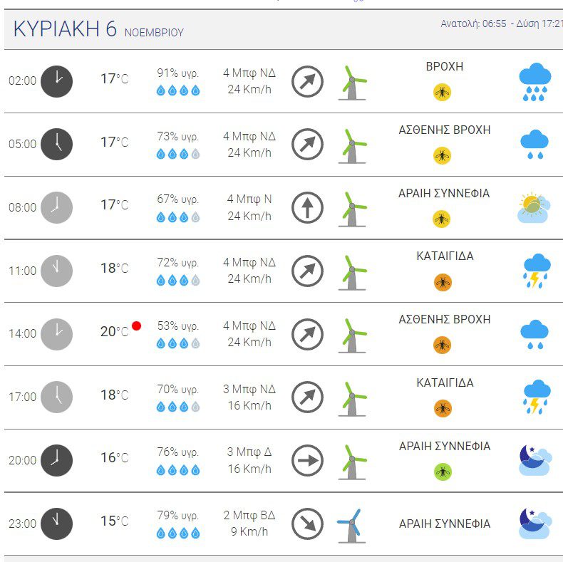Παρακάτω ο πίνακας από το meteo.gr για το πώς θα εξελιχθεί ο καιρός την Κυριακή (6/11/2022) στο κέντρο της Αθήνας