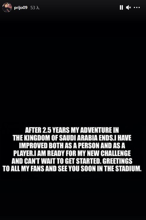 Γνωστό είχε γίνει εδώ και μέρες πως ο Αλεξάνταρ Πρίγιοβιτς είναι ελεύθερος από την Αλ Ιτιχάντ, κάτι που επισημοποίησε και ο ίδιος πλέον, στέλνοντας το δικό του ξεχωριστό μήνυμα.