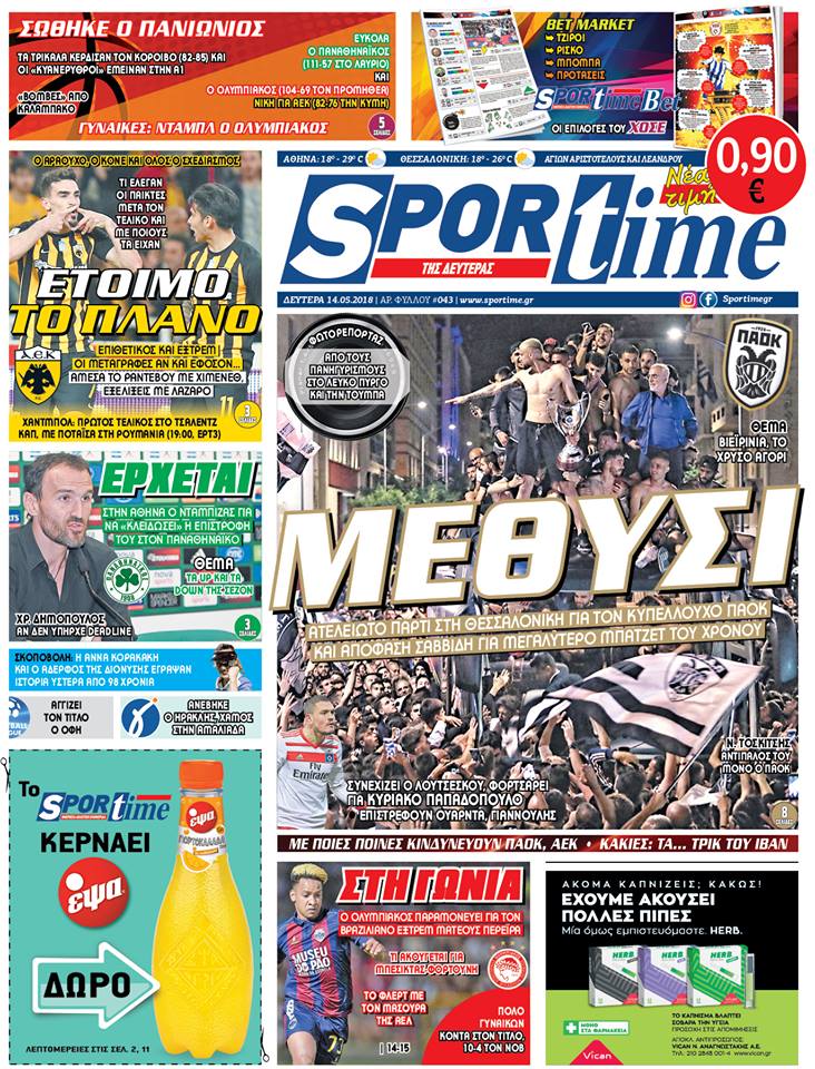 Τα πρωτοσέλιδα του αθλητικού Τύπου είναι η καλύτερη απάντηση. Το Sportime πιστό στις ιδέες της δημοσιογραφικής δεοντολογίας έκανε το αυτονόητο. Ποιο ήταν αυτό; Να τιμήσει ως όφειλε τον Κυπελλούχο ΠΑΟΚ και να τον κάνει ξεκάθαρα πρώτο θέμα στο φύλλο της Δευτέρας 14/5.