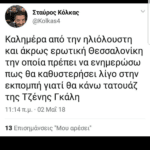 «Καλημέρα από την ηλιόλουστη και άκρως ερωτική Θεσσαλονίκη την οποία πρέπει να ενημερώσω πως θα καθυστερήσω λίγο στην εκπομπή γιατί θα κάνω τατουάζ της Τζένης Γκάλη».