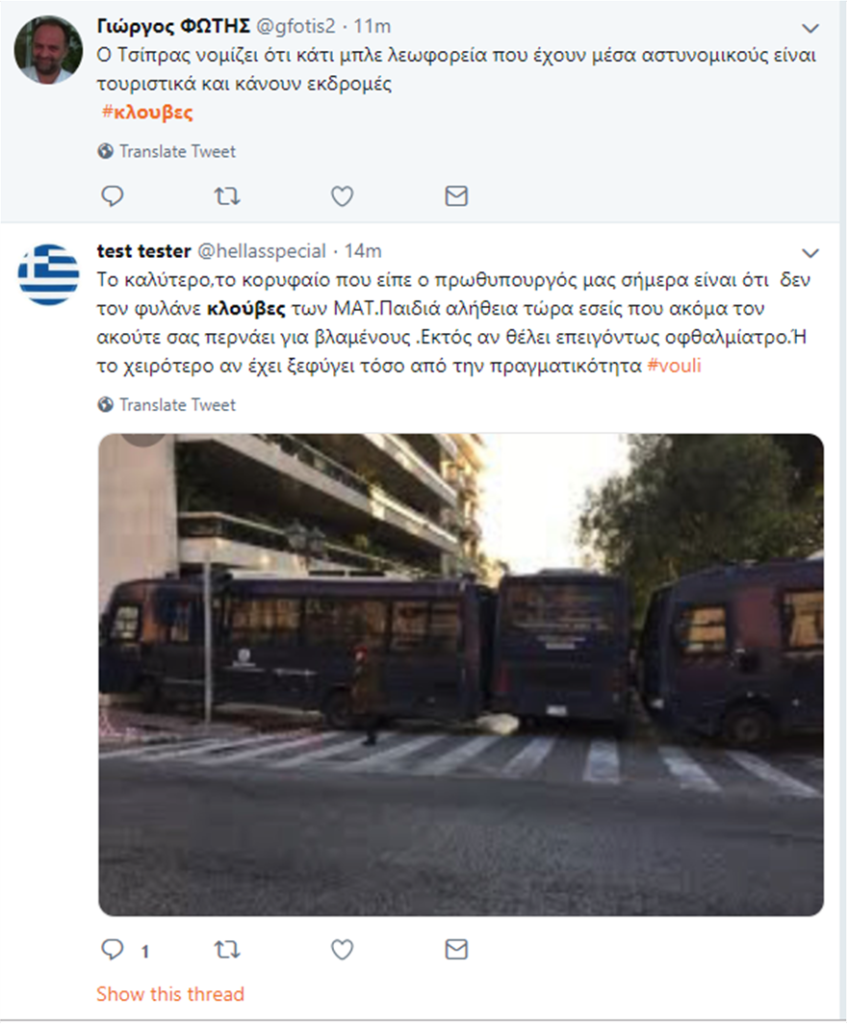Φωτογραφίες με κλούβες των ΜΑΤ, φανταστικοί χιουμοριστικοί διάλογοι και δεκάδες σχόλια με τον χαρακτηρισμός «ψεύτης», γέμισαν το twitter, καυτηριάζοντας το ψέμα του πρωθυπουργού.