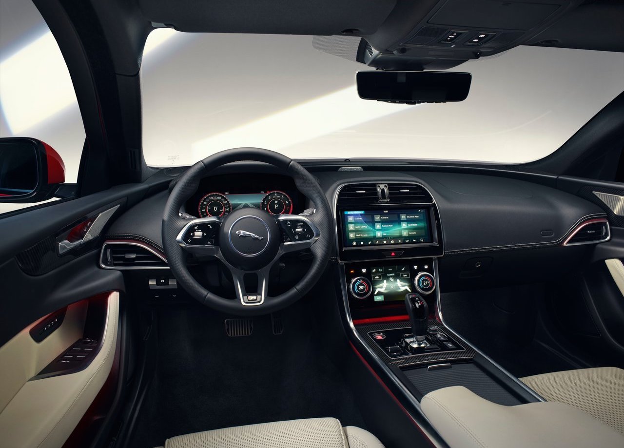 Εκεί φιλοξενείται πλέον το Touch Pro Duo σύστημα ενημέρωσης και ψυχαγωγίας από την ηλεκτρική I-Pace, με την οθόνη αφής των 10 ιντσών που “αγκαλιάζει” πλέον και τον αυτόματο κλιματισμό, ενώ η Jaguar εισάγει πλέον τα δερμάτινα καθίσματα στον στάνταρ εξοπλισμό.