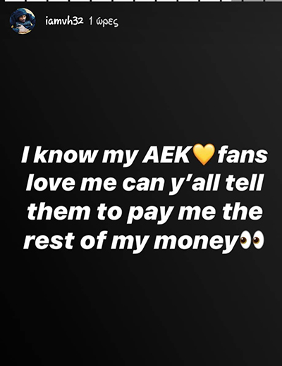 Γράφοντας στον προσωπικό του λογαριασμό στο instagram: «Ξέρω ότι οι φίλοι της ΑΕΚ με αγαπούν, οπότε μπορείτε να πείτε να με πληρώσουν τα υπόλοιπα χρήματά μου».