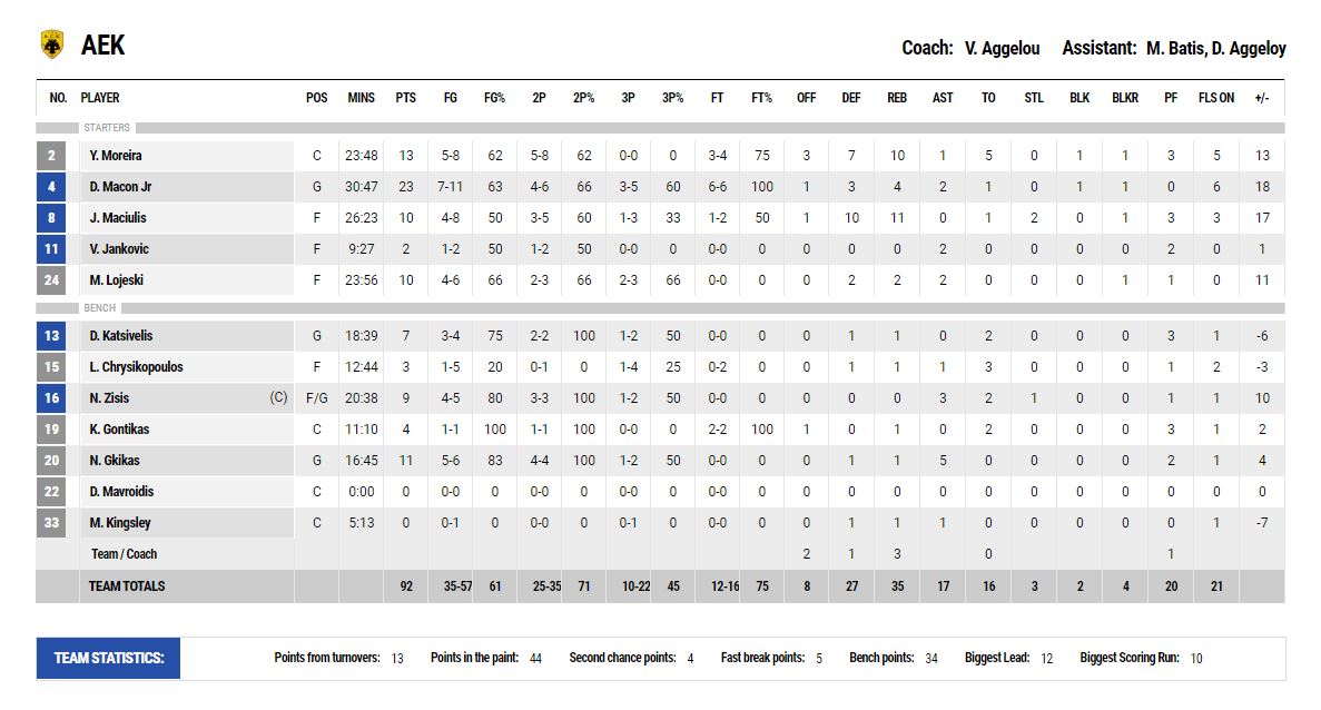 Μεγάλο παιχνίδι από Μέικον και Μορέιρα, καθοριστικοί Γκίκας και Ματσιούλις, ενώ η προσωπικότητα των Ζήση και Λοτζέσκι έπαιξε ρόλο. Τραγικός κι ασύνδετος ο Παναθηναϊκός, εκτός τόπου και χρόνου ο Κάτας, απολύτως τίποτα δεν έδειξαν οι «πράσινοι». Επιμέρους σκορ 53-33 (!!!) στο δεύτερο ημίχρονο για την ΑΕΚ.