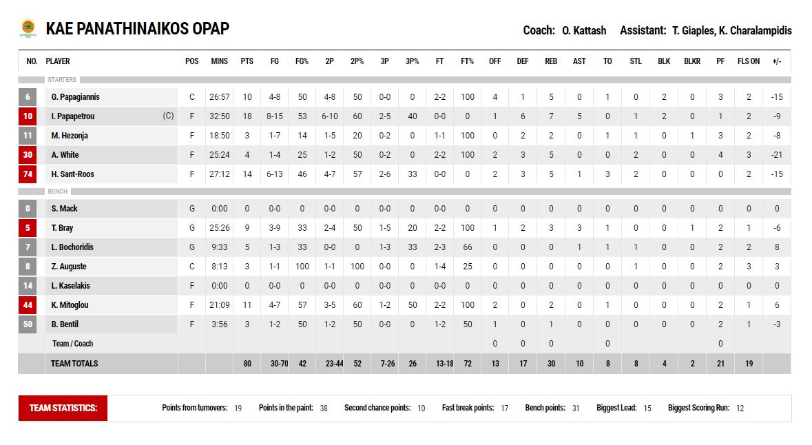 ΠΑΝΑΘΗΝΑΪΚΟΣ (Κάτας): Παπαγιάννης 10, Παπαπέτρου 18, Χεζόνια 3, Γουάιτ 4, Σαντ Ρος 14, Μπρέι 9, Μποχωρίδης 5, Όγκαστ 3, Μήτογλου 11, Μπέντιλ 3