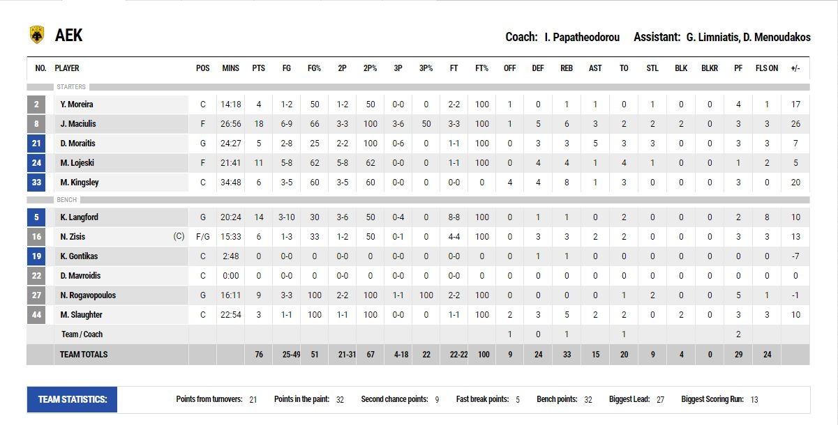 ΑΕΚ (Παπαθεοδώρου): Μορέιρα 4, Ματσιούλις 18, Μωραϊτης 5, Λοτζέσκι 11, Μόουζες 6, Λάνγκφορντ 14, Ζήσης 6, Γόντικας, Ρογκαβόπουλος 9, Σλότερ 3