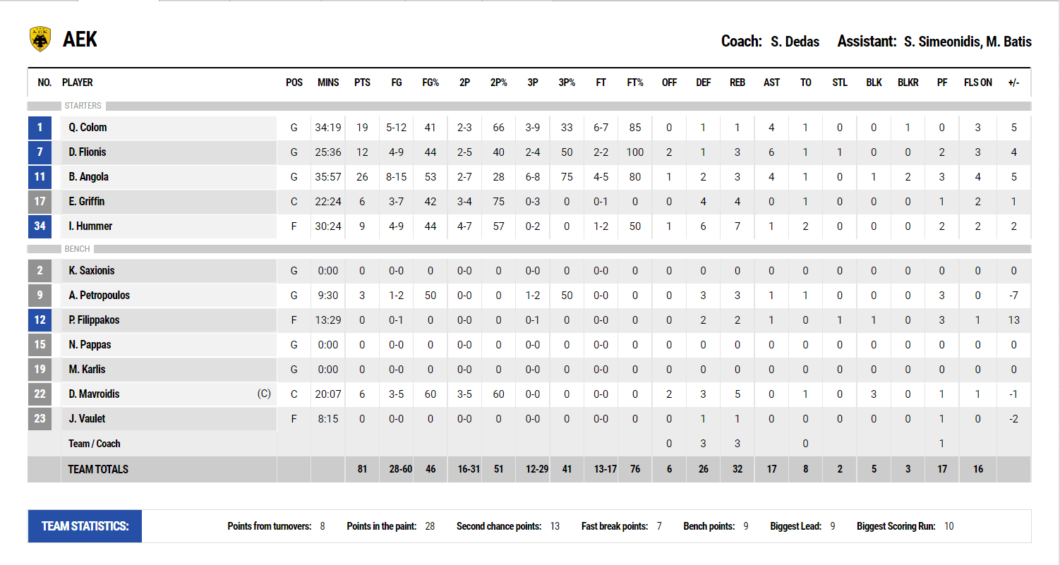 ΑΕΚ (Δέδας): Κολόμ 19, Φλιώνης 12, Ανγκόλα 26, Γκρίφιν 6, Χάμερ 9, Πετρόπουλος 3, Φιλιππάκος, Μαυροειδής 6, Βαουλέτ