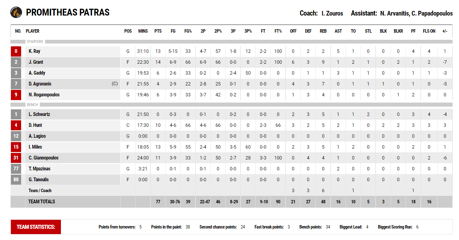 ΠΡΟΜΗΘΕΑΣ (Ζούρος): Ρέι 13, Γκραντ 14, Γκάντι 6, Αγραβάνης 4, Ρογκαβόπουλος 6, Σβαρτζ, Χαντ 10, Μάιλς 13, Γιαννόπουλος 11, Τανούλης