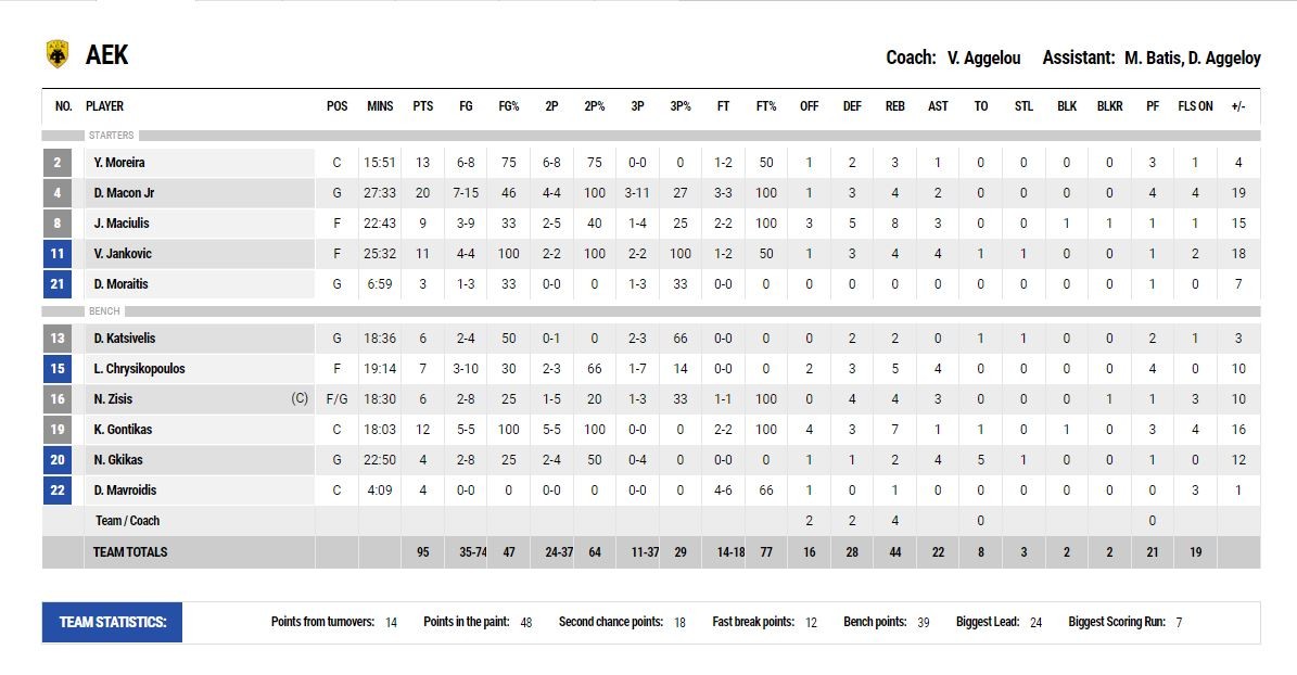 ΑΕΚ (Αγγέλου): Μορέιρα 13, Μέικον 20, Ματσιούλις 9, Γιάνκοβιτς 11, Μωραϊτης 3, Κατσίβελης 6, Χρυσικόπουλος 7, Ζήσης 6, Γόντικας 12, Γκίκας 4, Μαυροειδής 4