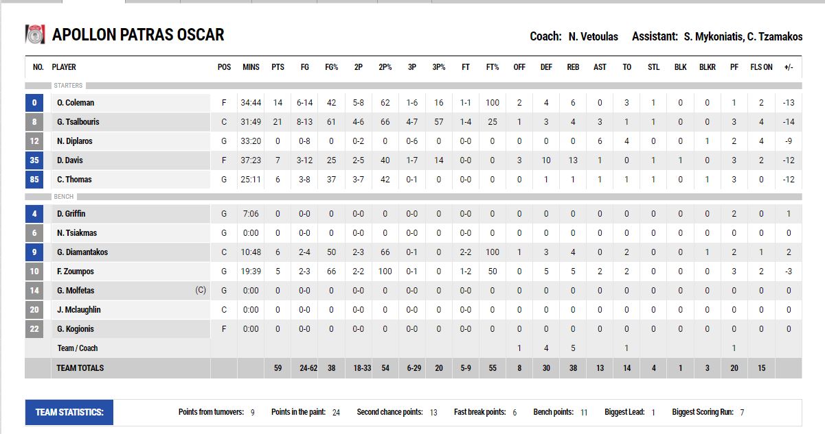 ΑΠΟΛΛΩΝ ΠΑΤΡΑΣ (Βετούλας): Κόλεμαν 14, Τσαλμπούρης 21, Δίπλαρος, Ντέιβις 7, Τόμας 6, Γκρίφιν, Διαμαντάκος 6, Ζούμπος 5