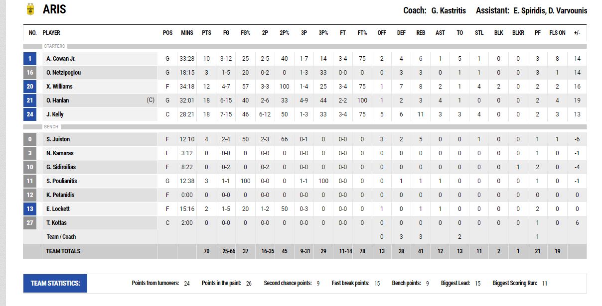 ΑΡΗΣ (Καστρίτης): Κάουαν 10, Νετζήπογλου 3, Γουίλιαμς 12, Χάνλαν 18, Κέλι 18, Τζούιστον 4, Καμάρας, Σιδηροηλίας, Πουλιανίτης 3, Λόκετ 2, Κώττας