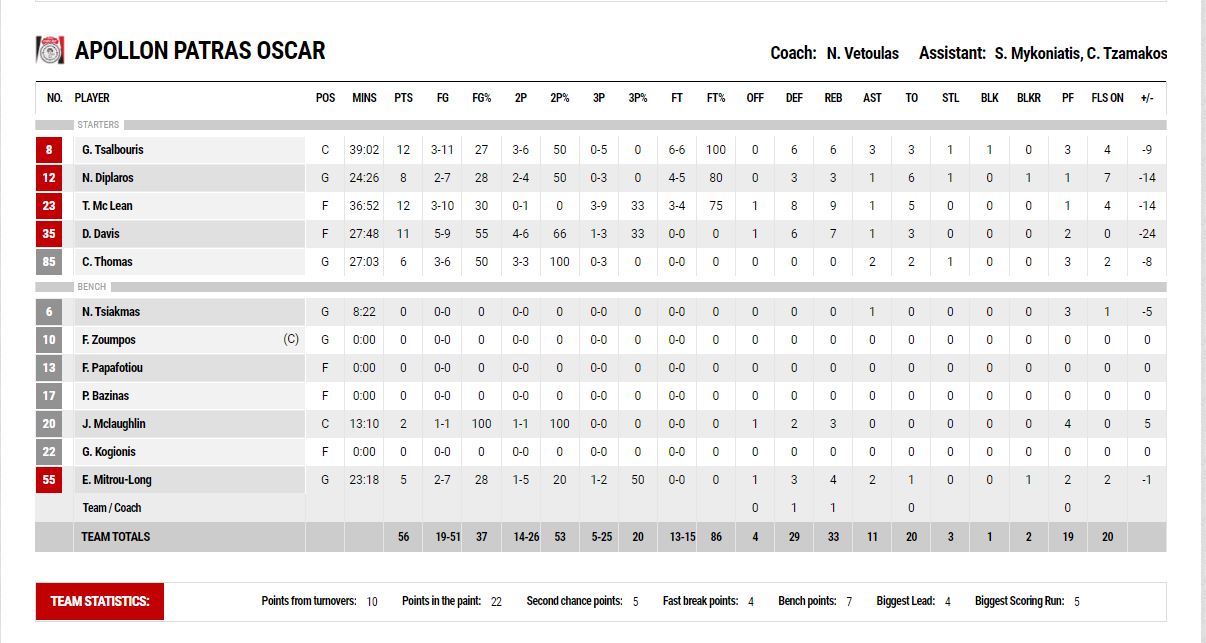 ΑΠΟΛΛΩΝ ΠΑΤΡΑΣ (Βετούλας): Τσαλμπούρης 12, Δίπλαρος 8, ΜακΛιν 12, Ντέιβις 11, Τόμας 6, Τσιακμάς, ΜακΛάφλιν 2, Μήτρου- Λονγκ 5