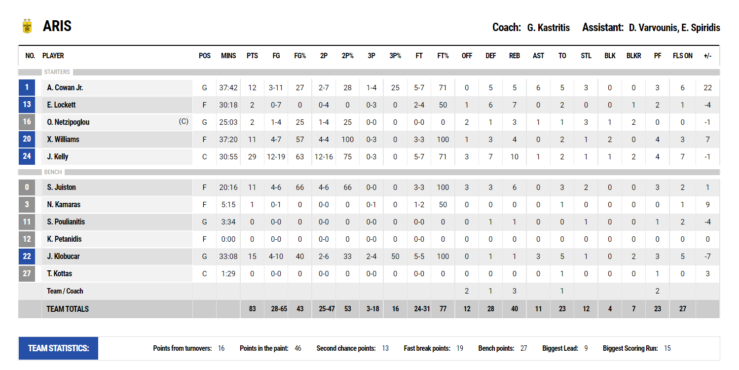 ΑΡΗΣ (Καστρίτης): Κάουαν 12 (2/7 δίποντα, 1/4 τρίποντα, 5/7 βολές, 5 ριμπάουντ, 6 ασίστ, 3 κλεψίματα, 5 λάθη), Λόκετ 2 (0/7 σουτ, 7 ριμπάουντ), Νετζήπογλου 2, Γουίλιαμς 11 (4/4 δίποντα, 3/3 βολές, 4 ριμπάουντ), Κέλι 29 (12/16 δίποντα, 0/3 τρίποντα, 5/7 βολές, 10 ριμπάουντ), Τζούστον 11 (4/6 δίποντα, 3/3 βολές, 6 ριμπάουντ, 2 κλεψίματα), Καμάρας 1, Πουλιανίτης, Κλόμπουτσαρ 15 (2/6 δίποντα, 2/4 τρίποντα, 5/5 βολές, 3 ασίστ, 5 λάθη), Κώττας