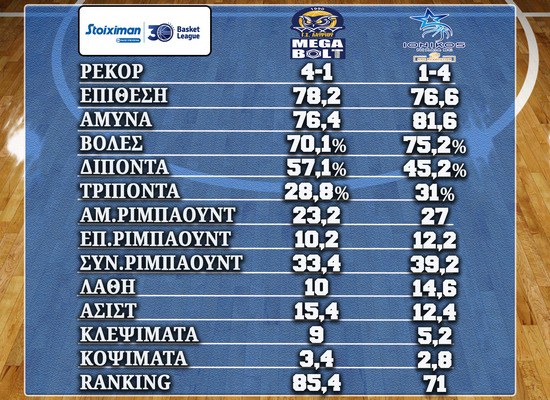 H ομάδα του Καντζούρη δέχεται λιγότερους πόντους και σκοράρει περισσότερο. Παρόλα αυτά η ΑΕΚ έχει καλύτερα ποσοστά σε βολές και δίποντα. Ο σύλλογος της Ρόδου υπερτερεί επίσης σε επιδόσεις σε ριμπάουντ, ασίστ και κλεψίματα.