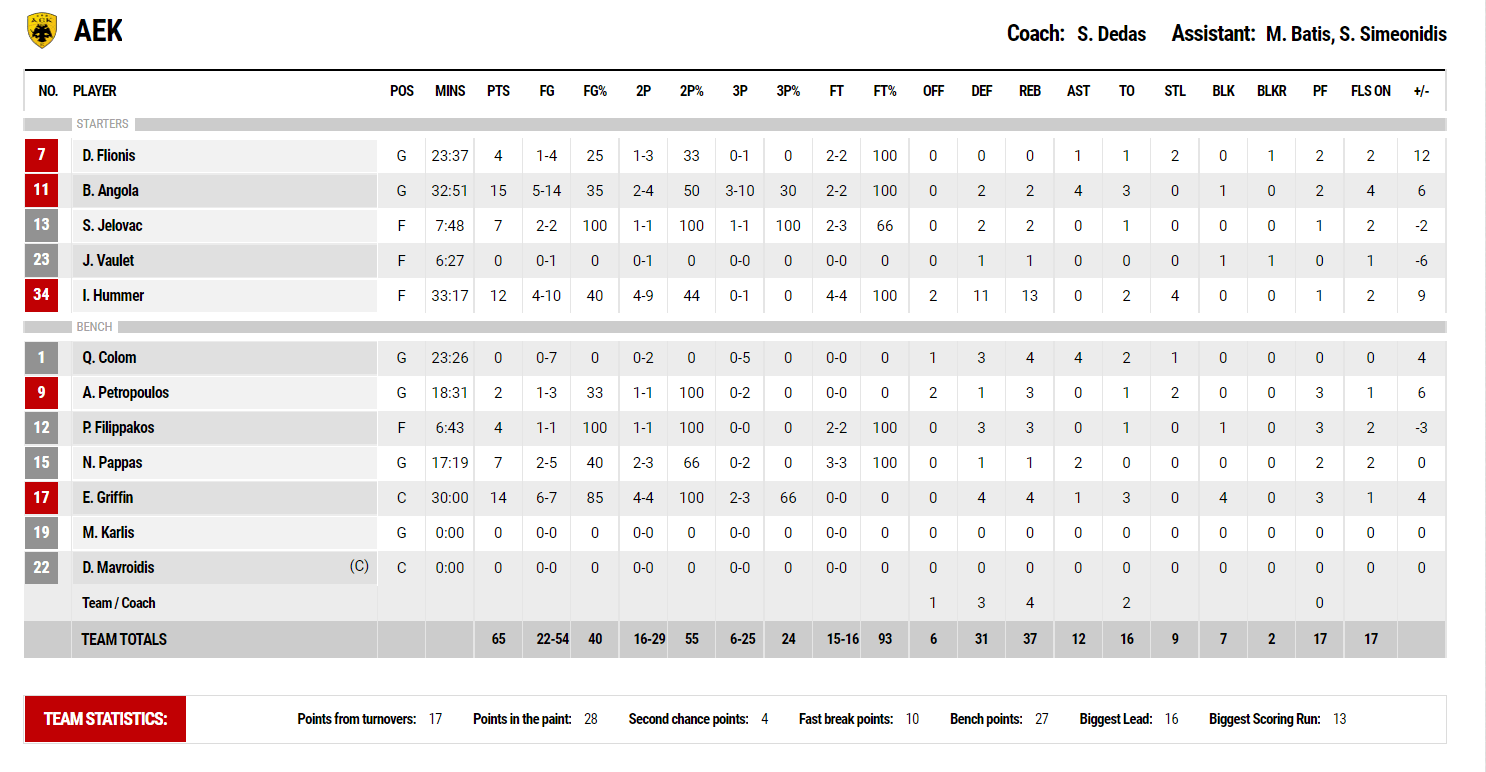 ΑΕΚ (Δέδας): Φλιώνης 4, Ανγκόλα 15, Γέλοβατς 7, Βαουλέτ, Χάμερ 12, Κολόμ, Πετρόπουλος 2, Φιλιππάκος 4, Παππάς 7, Γκρίφιν 14.