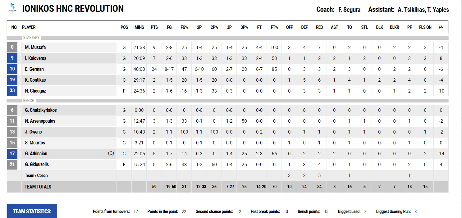 ΙΩΝΙΚΟΣ ΝΙΚΑΙΑΣ (Σεγκούρα): Μουσταφά 9, Κολοβέρος 7, Τζέρμαν 24, Γόντικας 2, Χουγκάζ 2, Αρσενόπουλος 3, Όουενς 2, Μούρτος, Αθηναίου 5, Γκιουζέλης 5