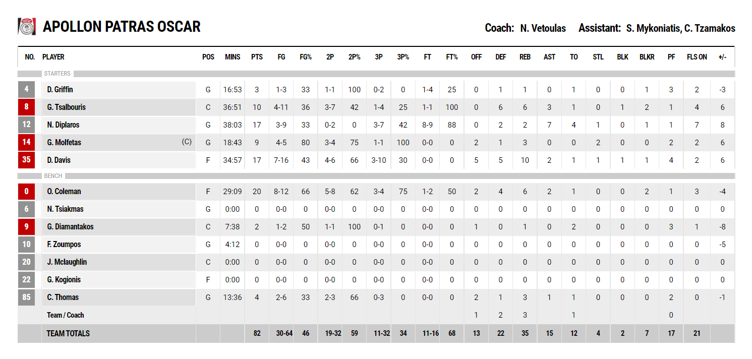 ΑΠΟΛΛΩΝΑΣ ΠΑΤΡΑΣ (Βετούλας): Γκρίφιν 3, Τσαλμπούρης 10, Δίπλαρος 17, Μολφέτας 9, Ντέιβις 17, Κόλεμαν 20, Διαμαντάκος 2, Ζούμπος, Τόμας 4