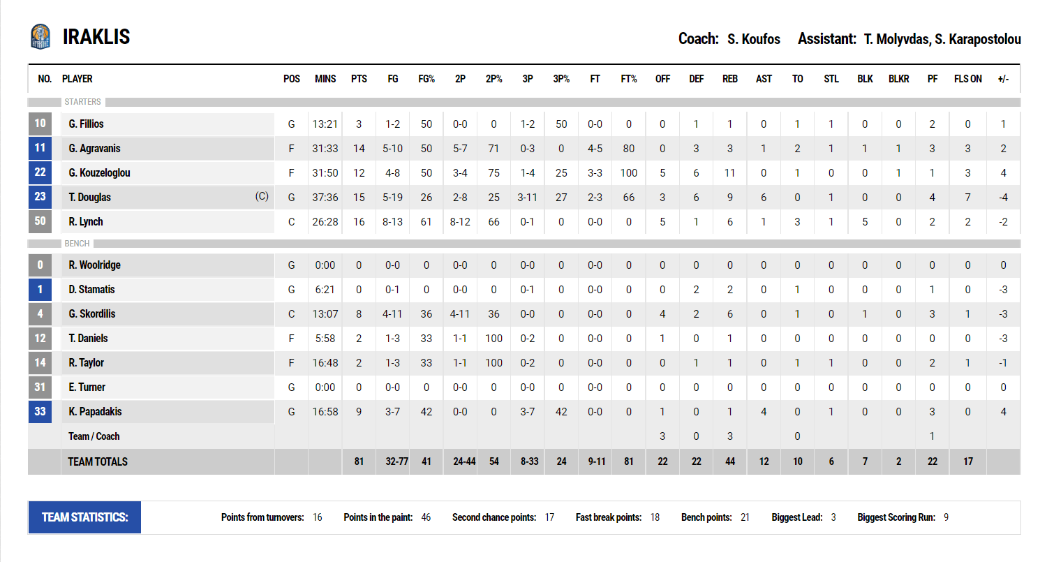 ΤΑ ΣΤΑΤΙΣΤΙΚΑ ΠΟΥ ΞΕΧΩΡΙΣΑΝ: Οι δύο ομάδες πήραν 17 (ο Ηρακλής) και 16 (ο Απόλλωνας) πόντους από επιθετικά ριμπάουντ. Όμως ο Ηρακλής είχε 22 επιθετικά ριμπάουντ, 9 παραπάνω από τον Απόλλωνα. Ο Κόλεμαν πέτυχε 8 πόντους σε 1’40’’ στο τελευταίο δεκάλεπτο. Double- Double σε πόντους και ριμπάουντ από Κουζέλογλου (12-11) και Ντέιβις (17-10).