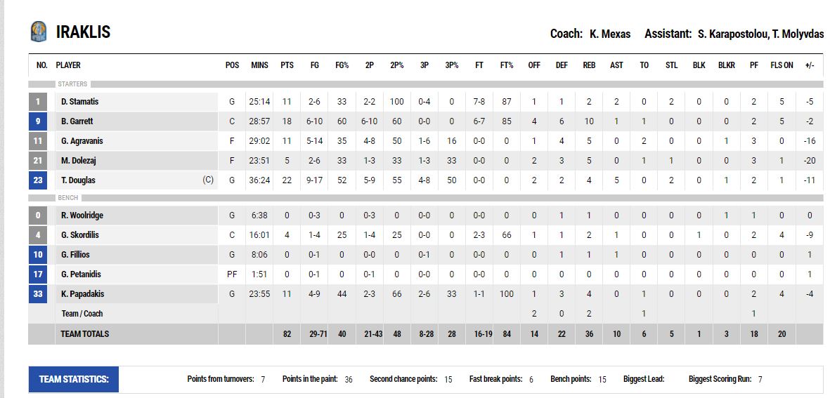 ΗΡΑΚΛΗΣ (Μέξας): Σταμάτης 11, Γκάρετ 18, Γ.Αγραβάνης 11, Ντόλεζαϊ 5, Ντάγκλας 22, Γούλριτζ, Σκορδίλης 4, Φίλλιος, Πετανίδης, Παπαδάκης 11
