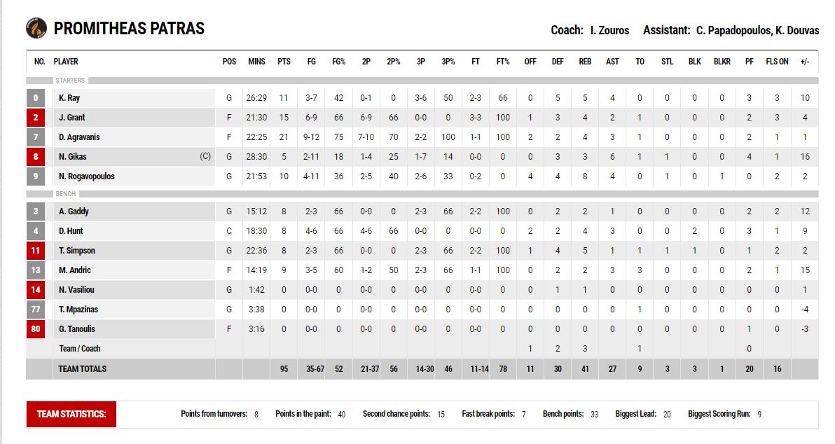 ΠΡΟΜΗΘΕΑΣ ΠΑΤΡΑΣ (Ζούρος): Ρέι 11, Γκραντ 15, Δ.Αγραβάνης 21, Γκίκας 5, Ρογκαβόπουλος 10, Γκάντι 8, Χαντ 8, Σίμπσον 8, Άντριτς 9, Βασιλείου, Μπαζίνας, Τανούλης.