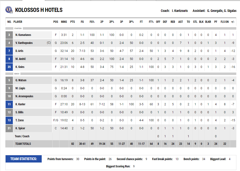 ΚΟΛΟΣΣΟΣ ΡΟΔΟΥ (Καντζούρης): Καμαριανός 2, Ξανθόπουλος 6, Άρτις 20, Άντριτς 10, Γκόινς 10, Γουάτσον 8, Λιάπης, Καντέρ 20, Μπιλής, Ζάρας 4, Σπάισερ 2
