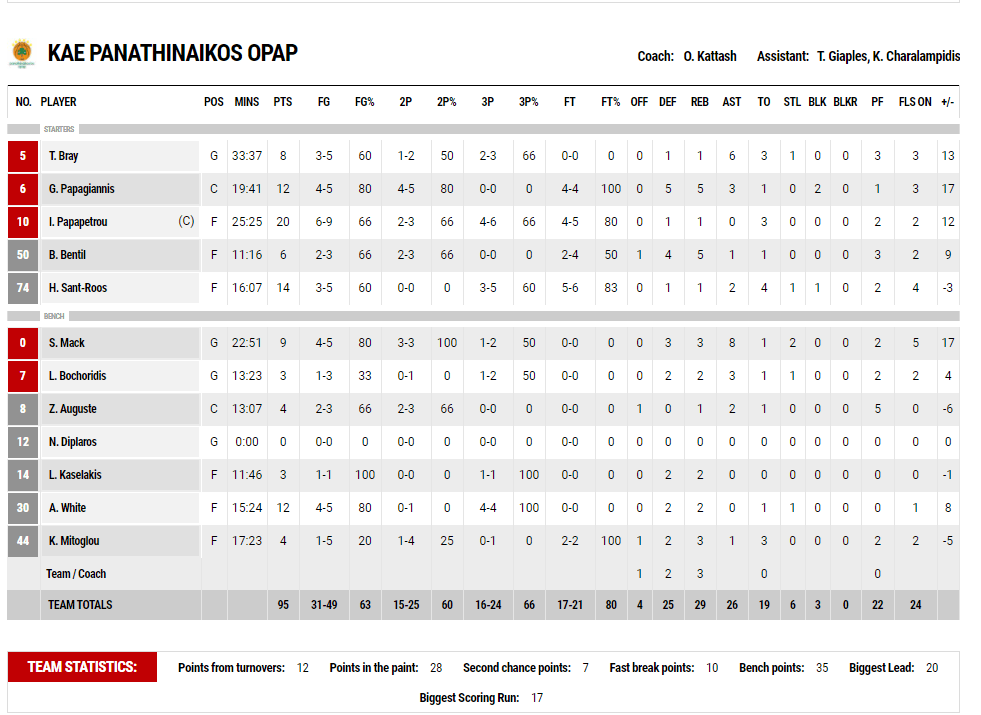 ΠΑΝΑΘΗΝΑÏΚΟΣ (Κάτας): Μπρέι 8, Παπαγιάννης 12, Παπαπέτρου 20, Μπέντιλ 6, Σαντ Ρος 14, Μακ 9, Μποχωρίδης 3, Όγκαστ 4, Κασελάκης 3, Γουάιτ 12, Μήτογλου 4