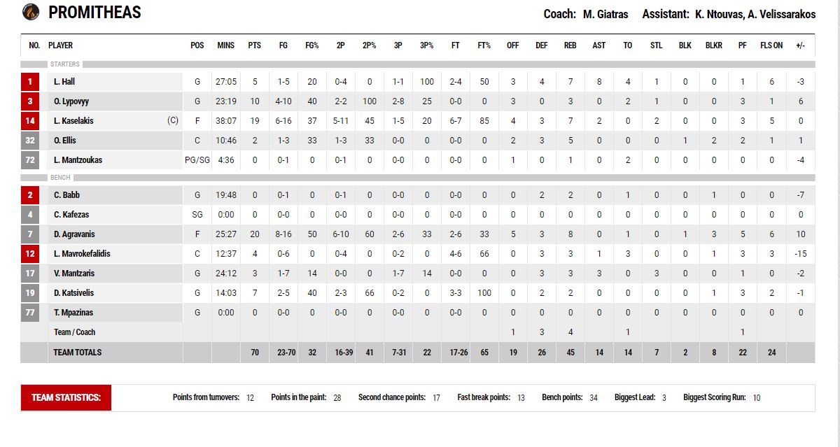 Προμηθέας Πάτρας (Γιατράς): Χολ 5 (1/5 σουτ, 7 ριμπάουντ, 8 ασίστ, 4 λάθη), Λίποβι 10 (2/8 τρίποντα), Κασελάκης 19 (6/16 σουτ, 7 ριμπάουντ), Έλις 2 (5 ριμπάουντ), Μαντζούκας, Μπαμπ, Αγραβάνης 20 (6/10 δίποντα, 2/6 τρίποντα, 2/6 βολές, 8 ριμπάουντ), Μαυροκεφαλίδης 4, Μάντζαρης 3 (1/7 τρίποντα), Κατσίβελης 7.