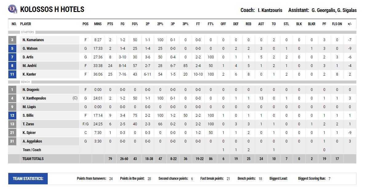 ΚΟΛΟΣΣΟΣ (Καντζούρης): Καμαριανός 2, Γουάτσον 2, Άρτις 8, Άντριτς 24, Καντέρ 25, Ξανθόπουλος 2, Μπιλλής 9, Ζάρας 6, Σπάισερ 1, Αγγελάκος