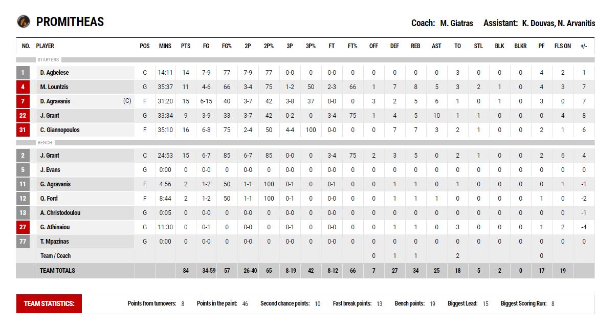 ΠΡΟΜΗΘΕΑΣ (Γιατράς): Αγκμπελίς 14, Λούντζης 11, Δ.Αγραβάνης 15, Τζέριαν Γκραντ 9, Γιαννόπουλος 16, Τζεράι Γκραντ 15, Γ. Αγραβάνης 2, Φορντ 2, Χριστοδούλου, Αθηναίου