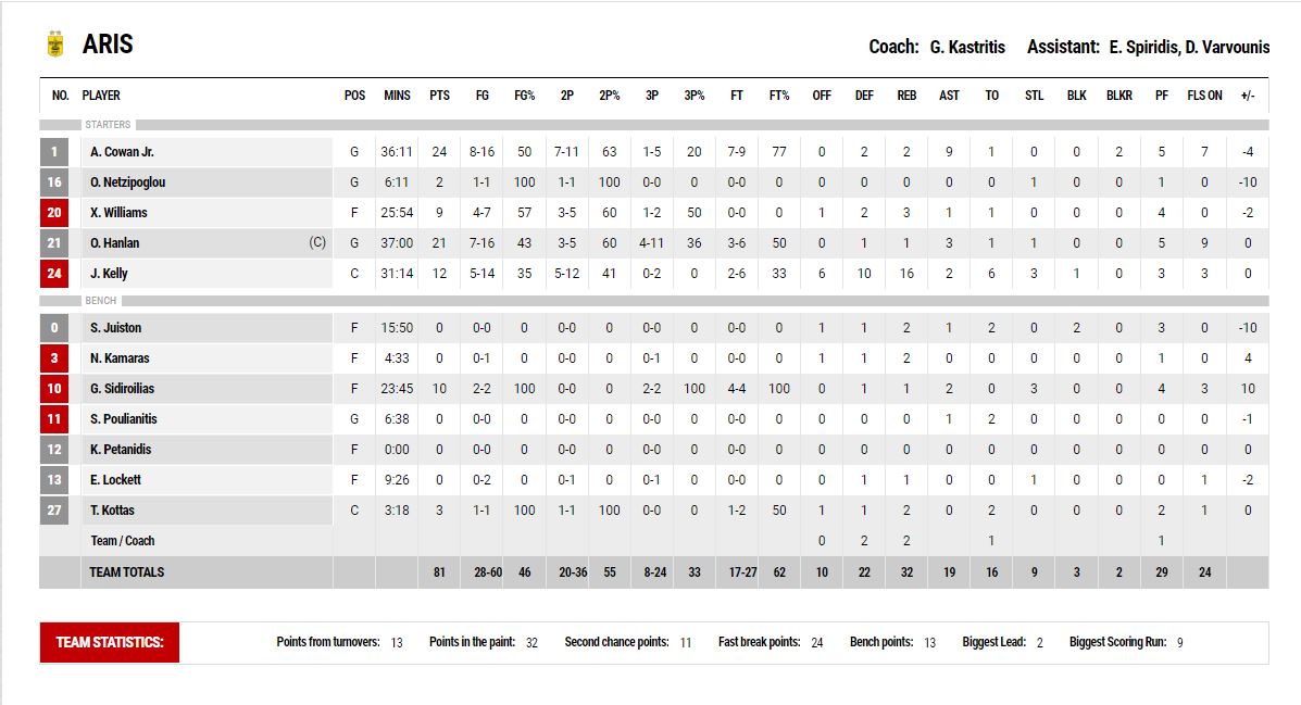 ΑΡΗΣ (Καστρίτης): Κάουαν 24, Νετζήπογλου 2, Γουίλιαμς 9, Χάνλαν 21, Κέλι 12, Τζούιστον, Καμάρας, Σιδηροηλίας 10, Πουλιανίτης, Λόκετ, Κώττας 3