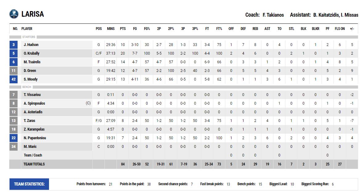 ΛΑΡΙΣΑ (Τακιανός): Χάντσον 10, Κρουμπάλι 20, Τσαϊρέλης 14, Γκριν 12, Μούντι 13, Βησσαρίου, Σπυρόπουλος, Ζάρας 8, Καράμπελας, Παπαντωνίου 7.